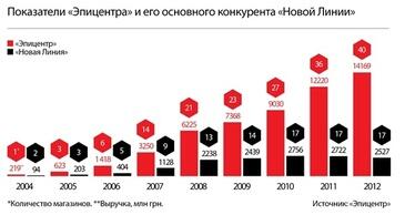 6 декабря 2003 года первый «Эпицентр» с маленькой «к» в логотипе открыл свои двери. В магазине площадью 17 000 кв. м – втрое большей, чем у «Новой Линии», предлагалось 50 000 товарных позиций. Огромный строительный маркет быстро стал достопримечательностью – за первый год работы его выручка достигла 219 млн гривен. У «Новой Линии» в 2004-м было уже два супермаркета, но их суммарный доход не превышал 95 млн. Оказалось, что размер имеет значение.