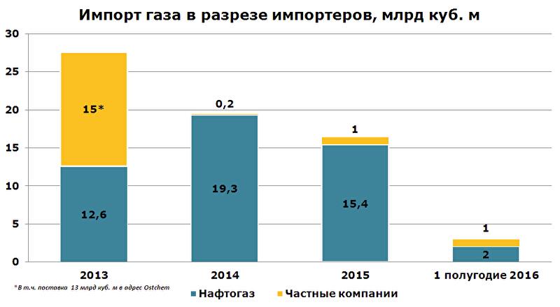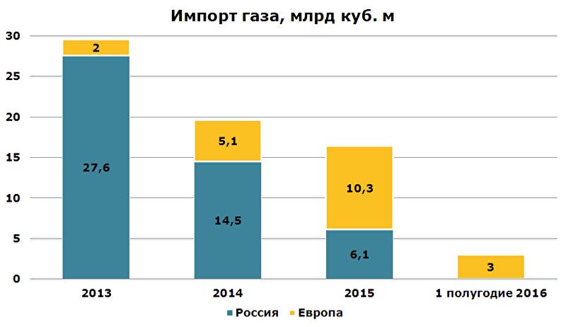 Наиболее наглядно изменения на газовом рынке проявились на примере импорта. С 2013 года доля прямых поставок российского газа снизилась с 93 до 37%. Это прямое следствие расширения реверсных маршрутов доставки газа из Европы. В первом полугодии 2016 года Нафтогаз и вовсе не покупал голубое топливо в России.