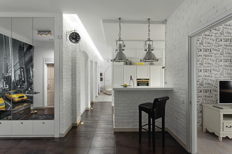 Игра снаружи/внутри поддержана в зоне прихожей – совсем «уличными» часами с черным циферблатом, урбанистическими фотообоями и грубым люком из чугуна, вмонтированным прямо в пол.