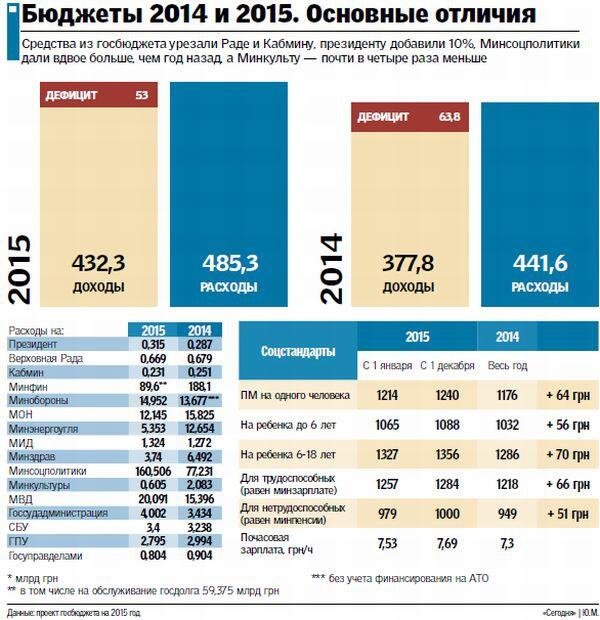 Бюджет на 2015 год, стремительно появившийся в Раде и так же быстро исчезнувший из нее, попал в руки журналистам. Однако наши источники в Кабмине и эксперты утверждают, что это вариант, который не понравился МВФ, ведь в нем, несмотря на серьезный спад экономики и военные действия в Украине, заложен рост доходов на 54 млрд грн, а расходов — на 43 млрд грн. Поэтому представители МВФ требуют, дабы бюджет серьезно переделали, причем в сторону ужесточения, иначе очередного кредита от Фонда нам не видать (это, напомним, около $4 млрд). Однако в любом случае этот вариант — лучше, чем ничего. Будет с чем сравнить, когда увидим итоговый бюджет-2015.