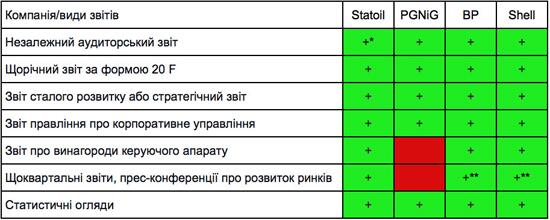 У розміщеній нижче таблиці наведені результати невеликого дослідження, що демонструють ступінь розкриття інформації цими компаніями. У дослідженні використовувалися офіційні сайти названих фірм. Дослідження показало, що компанії на своїх сайтах публікують такі основні звіти.