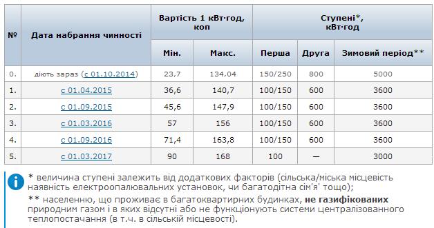 | Домохозяйства с объемом потребления свыше 600 кВтч в месяц с 1 апреля 2015 года будут платить 1,4 грн за кВтч. Для них повышение составит 5%. |