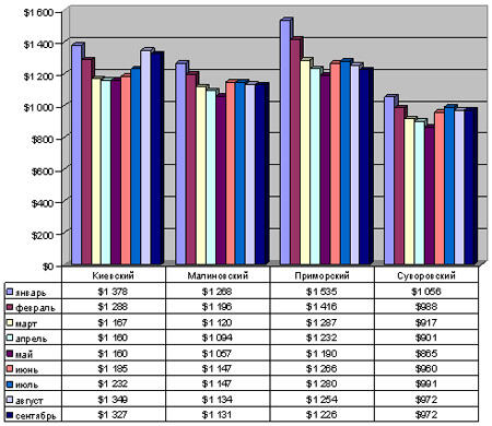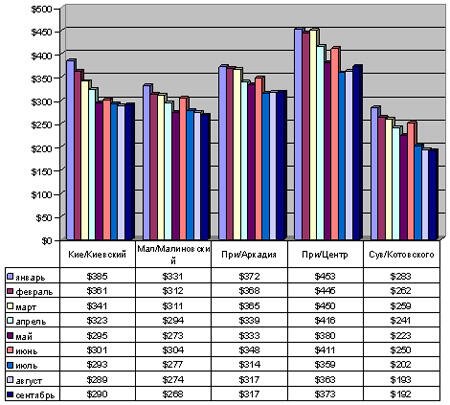 Как сообщили аналитики, самым дешевым на рынке вторичного жилья остается Суворовский район. В течении двух месяцев стоимость 1кв.м. там держится на уровне $972. А вот традиционно дорогой Малиновский район в сентябре потерял в цене с $1 тыс.134 до $1тыс.131 за "квадрат" (см. Таблицу 1.).