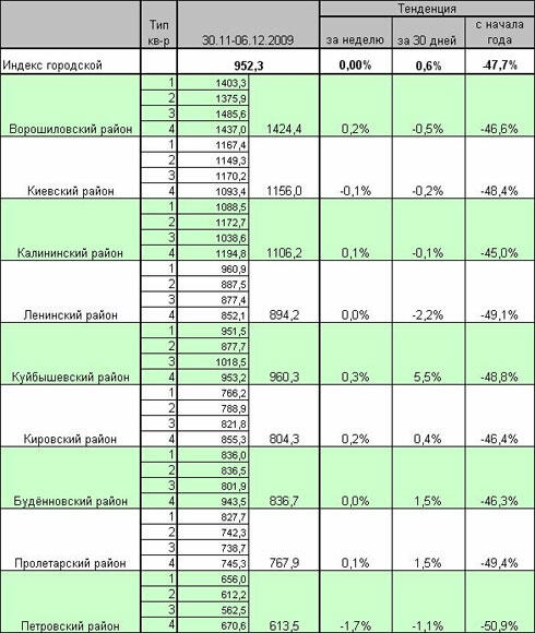 В то же время по данным компании "SV Development", за период с 1 по 6 декабря 2009 года средняя цена продажи 1-3 комнатных квартир на вторичном рынке в Донецке выросла на 0,84% ($9) до $1 086 за 1 кв.м. Самым дешевым оставался Петровский район, со средним показателем $703/кв.м., самым дорогим Ворошиловский район, где средняя цена продажи составила $1 382/кв.м.