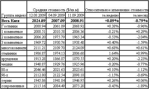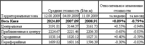 Напомним, что по данным компании "SV Development", за период с 7 по 13 сентября 2009 года средняя цена продажи 1-3 комнатных квартир на вторичном рынке в Киеве выросла на 0,30% ($5) до $1 526 за 1 кв.м.