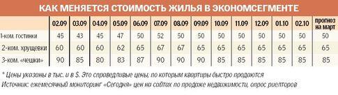 Некоторые из опрошенных нами экспертов прогнозируют повышение цен на рынке недвижимости уже в ближайшее время. Так, по мнению Александра Охрименко, президента Украинского аналитического центра, стабильный доллар заставит владельцев валюты искать новые объекты инвестирования, и в этой ситуации инвестиции в жилье будут одним из главных направлений вложения валюты. «При стабильном курсе можно ожидать рост цен на жилье экономкласса на 20—25% в течение весны-лета 2010», — прогнозирует эксперт. Однако, как показало наше небольшое исследование, квартиры, выставленные даже по среднерыночной сегодняшней цене, не продаются.