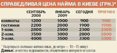 По данным портала realt.ua, за февраль 2010 года средняя цена аренды квартир в Киеве выросла на 4,42%. Однако, как отмечают опрошенные нами эксперты, цены в экономсегменте в последний месяц зимы оставались стабильными. «Особых измений я не вижу, — говорит Алексей Холмецкий. — В Киеве же ничего не поменялось. Один из журналов по трудоустройству по-прежнему тоньше в 5 раз, чем до кризиса». «Цены на самые ходовые квартиры не растут, — подтверждает Юрий Базелинский. — А если истекает срок договора и его перезаключают, то хозяева могут даже уступить 10—15%. Потому что эту сумму им и так придется скидывать, если будут искать новых квартирантов».