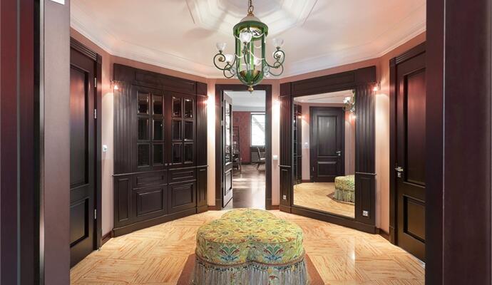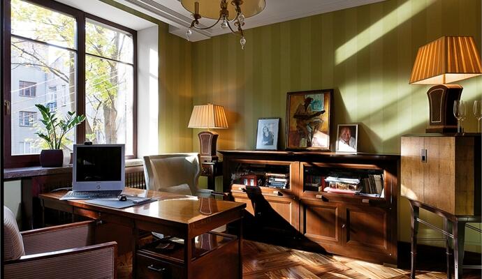 Определяющим фактором атмосферы пространства является насыщенная цветовая палитра: не довольствуясь полумерами, авторы проекта сделали красную гостиную и зеленый кабинет, а для кухни, ванной и холла предложили графичные контрастные решения, воплощенные в драгоценных отделочных материалах. Еще один любопытный нюанс интерьера — свободные от какого-либо текстильного оформления окна. Несмотря на неоднократные подходы к этому вопросу, идеи архитекторов, одна за другой, были отвергнуты. Заказчик доволен романтичным видом на вековые клены (и уверен, что они, в свою очередь, тоже довольны видом в его окна) и наотрез отказался от штор. Что-то в этом есть.