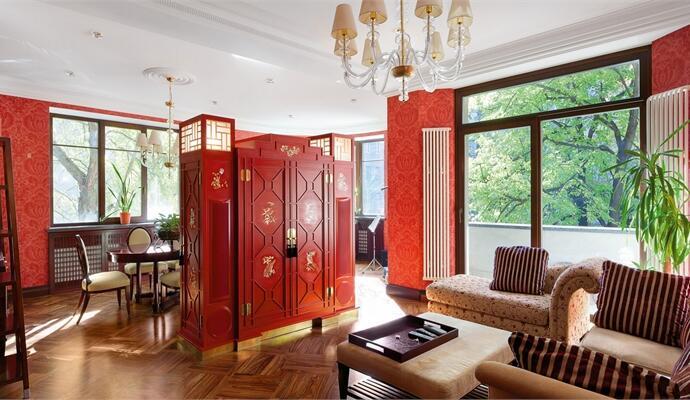 Насыщенный цвет стен гостиной мог бы показаться слишком смелым — если бы не «китайский гость» в центре гостиной. Привлекая к себе основное внимание, сервант оставляет стенам второстепенную роль фона.