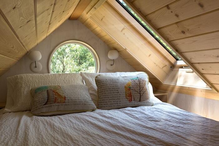 Кровать расположена на антресоли. Для строительства дома была выбрана экологически чистая древесина светлых оттенков, визуально расширяющих пространство. Учитывая размеры структуры, внутри установлена мебель, которая может выполнять сразу несколько функций: под небольшим диванчиком находятся встроенные шкафы, а тумбочку при желании можно сделать компактным журнальным столиком.