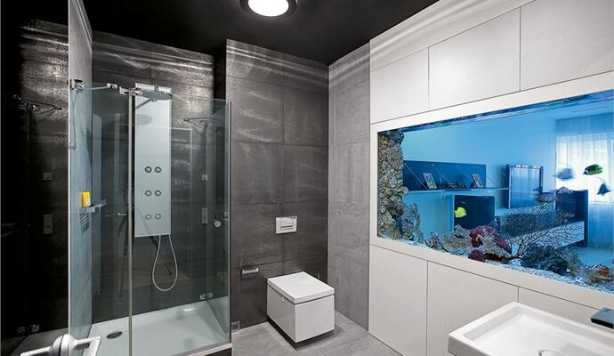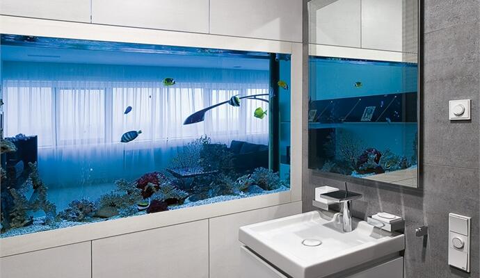 Гостевой санузел обращает на себя внимание еще из гостиной: его можно рассмотреть через интегрированный в перегородку аквариум. Достаточно повнимательнее понаблюдать за тропическими рыбками — и можно составить вполне четкое представление о немецком сантехническом минимализме. Впрочем, такое аквариумное решение имеет вполне убедительное функциональное обоснование, поскольку дает возможность впустить в помещение дневной свет. Остальные комнаты, имеющие доступ к естественному освещению, — спальня и кабинет — выходят окнами на башню-близнеца. Впрочем, кабинетом пришлось пожертвовать: где-то на этапе отделки квартира перестала быть холостяцкой и появилась необходимость в детской. Так что на момент съемки рабочий стол и компьютер все еще находились на занятых позициях, но детская кроватка с армией игрушек уже наступали.