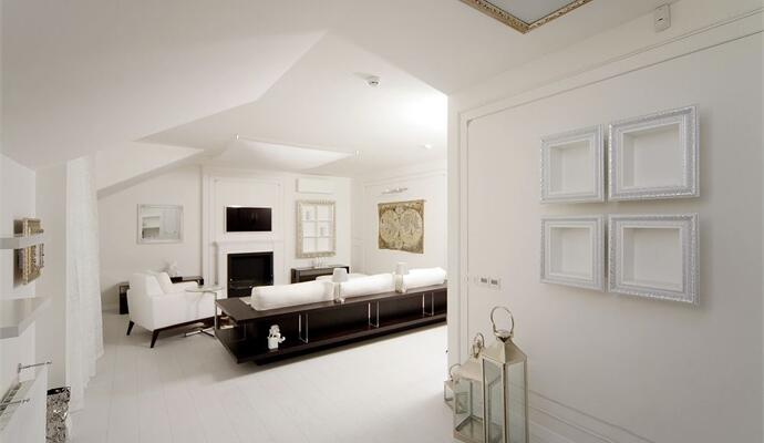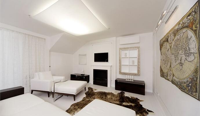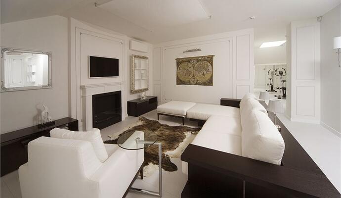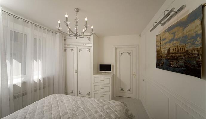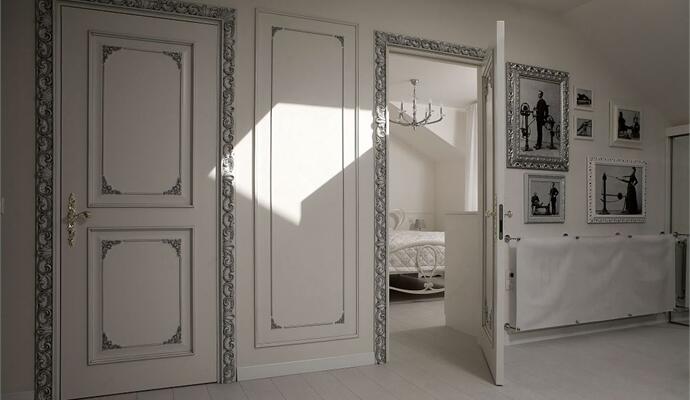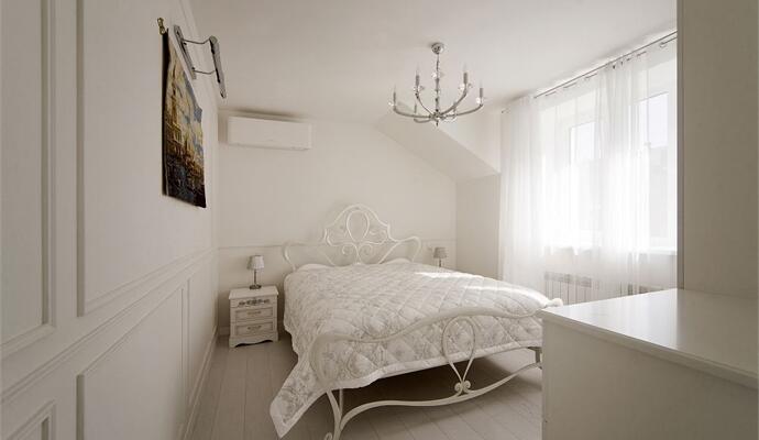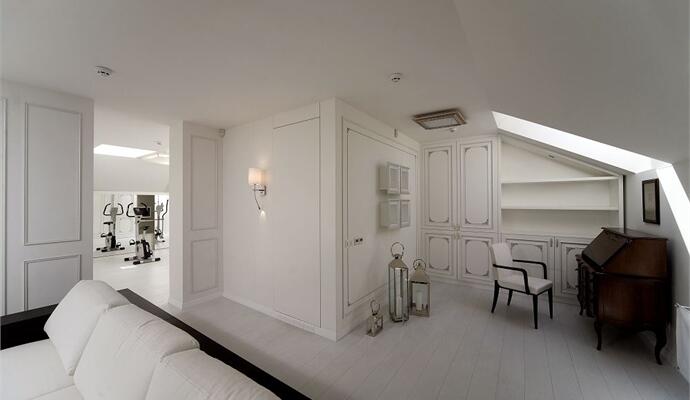 В зоне отдыха установлены современный модульный диван и кресло — все в белоснежной обивке; телевизионная панель, невысокие шкафчики для книг и камин, работающий на биотопливе. В кабинете — классическое бюро на изогнутых ножках. Стены украшены ткаными гобеленами — они настоящие и прекрасно дополняют целомудренно чистый интерьер. На пол гостиной «брутально» брошена пестрая шкура коровы. Ряд предметов изготовлен на заказ по авторским эскизам, их детали деликатно состарены и посеребрены. Все двери и наличники покрыты ручной резьбой.