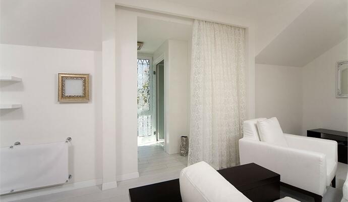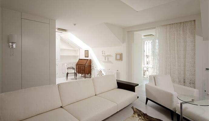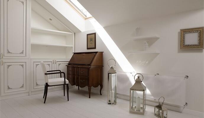 Еще один момент — несмотря на мансардный этаж, на втором уровне оказалось мало света. Всего три окошка, одно наполовину закрытое подъемником. Единственно правильным решением стала «оптическая локация» (по-другому не скажешь) пространства белым цветом. А дабы стилистически подтянуть интерьер к легкой классике (в ней решена нижняя квартира), колористику облагородили декадентским серебром. Материалы для отделки выбрали исключительно натуральные; из мебели — только самые необходимые предметы интерьера.