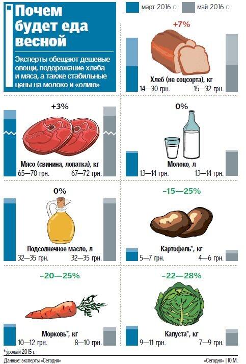 По данным Госстатистики, средняя зарплата в январе, по сравнению с декабрем 2105 г., упала почти на 900 грн: было 5320 грн, стало — 4362 грн, или на 17% меньше. Первыми, по прогнозам экспертов, начнут дорожать мясо и хлеб несоциальных сортов. Но есть и хорошая новость: в конце апреля — мае начнут овощи дешеветь из-за того, что появятся плоды нового урожая — морковь, редис, зеленый лук. Какими могут быть цены на некоторые продукты, см. инфографику.