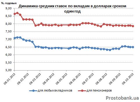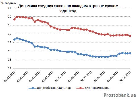 По исследованию компании «Простобанк Консалтинг» на середину окрября-2013, средняя ставка по депозитам для любых вкладчиков сроком на год на 0,6 процентного пункта ниже, чем в январе-2013, и составляет 6,5% годовых. В тоже время средние ставки по вкладам для пенсионеров с начала года просели на 0,8 процентного пункта – до 7,9% годовых. Таким образом, разница в средней доходности между вкладами для пенсионеров и любых категорий вкладчиков с начала 2013 года тоже снизилась: на 0,2 процентного пункта, до 1,3 процентного пункта.