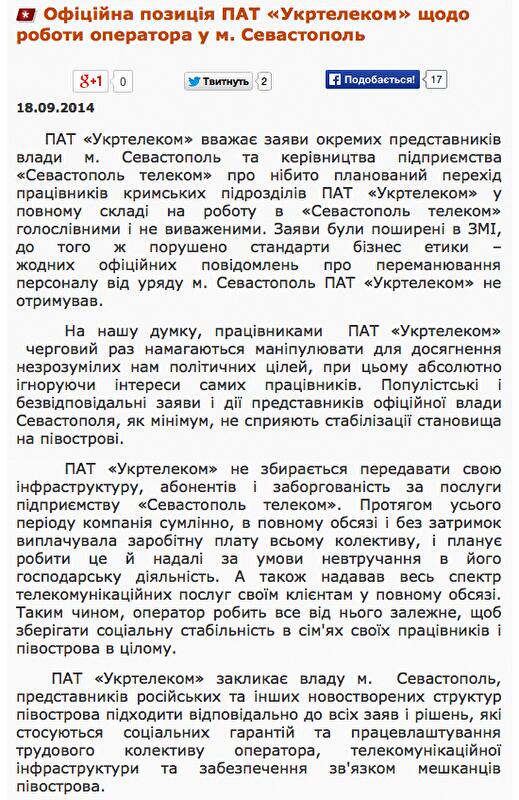17 сентября "правительство" Севастополя заявило, что создание на базе "Укртелекома" государственного унитарного предприятия "Севтелеком" близится к концу. К этому моменту связью в городе управлял "Севтелеком". Де-юре активы "Укртелекома" планировалось перевести в "Севтелеком" до 15 октября.