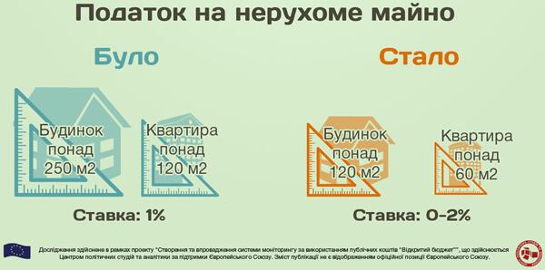 Рік тому оподатковувалася площа, яка перевищує 120 кв м для квартир і 240 кв м для будинків. Тепер цей податок втратив умовний статус "для багатих": податок братимуть з площі понад 60 кв м для квартир і понад 120 кв м для будинків.