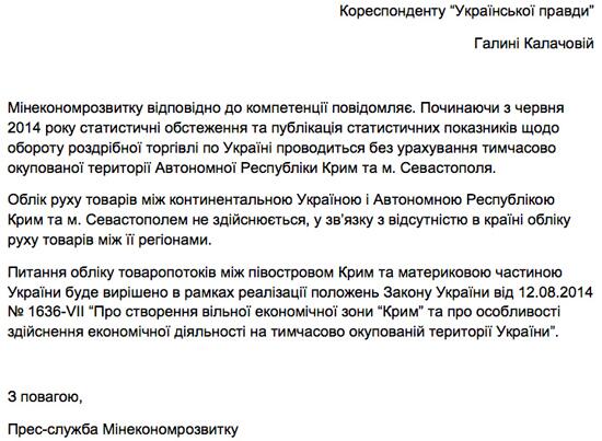 Отсутствие статистики в министерстве аргументировали тем, что полуостров - это территория Украины, а "учет товаров между "континентальной" Украиной и АРК не осуществляется в связи с отсутствием в стране учета между ее регионами". В целом позиция министерства выглядит так.