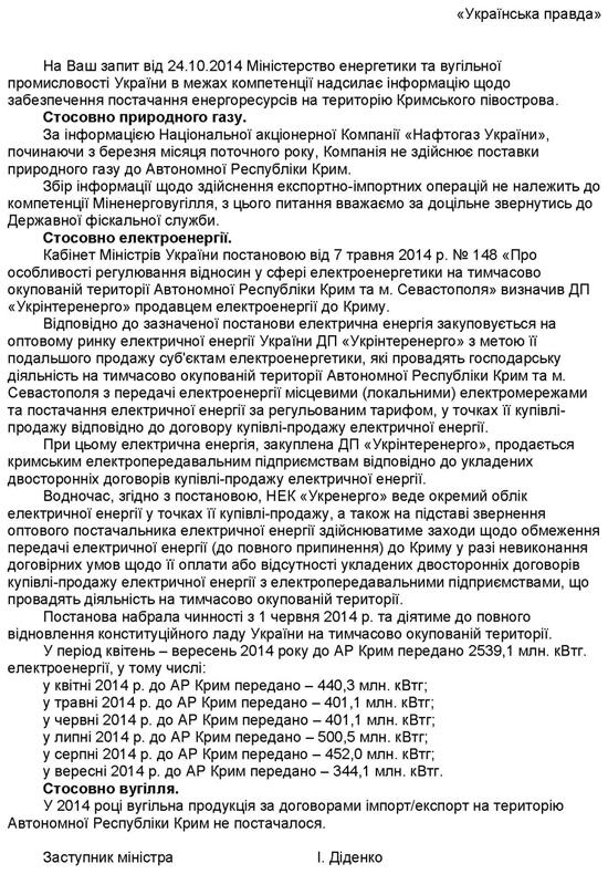 По словам члена Наблюдательного совета Института энергетических стратегий Юрия Корольчука, до аннексии Крым в год сам производил 2 млрд кВт и еще 4,3 млрд кВт шло из Украины. Киев осуществляет эти поставки и после аннексии.