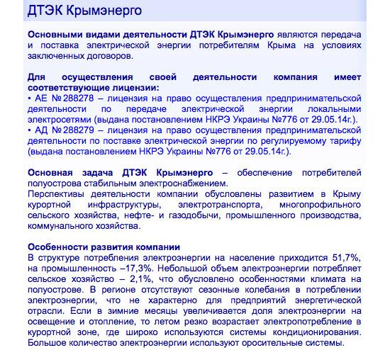 Почему убытки меньше ожидаемых - непонятно. Источники ЭП утверждают, что "ДТЭК Крымэнерго" якобы напрямую не продает ток потребителям Крыма, а передает электроэнергию на специально созданную структуру "Интер РАО".