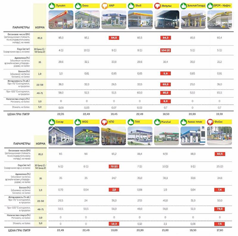 Все заправки, на которых нам продали бензин низкого качества, удалены от основных дорог. Так, аутсайдер нашего теста с 7,4 % содержанием бензола находится недалеко от фармкомбината на Борщаговке (ООО «Фобос»), а небрендовая заправка с 6% метанола спрятана в гаражном кооперативе под виадуком на Оболони (ООО «Импульс»). Даже сетевая АЗС (КЛО), где мы выявили несоответствия по сере и спирту, удалена от основной дороги.