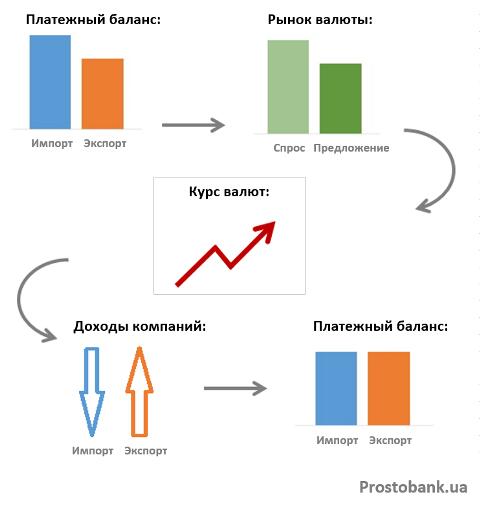 Теоретически это выглядит следующим образом. Основные игроки на валютном рынке – это производители-экспортеры и компании-импортеры. Экспортеры продают иностранную валюту, вырученную от продажи своей продукции за рубежом. Импортеры покупают валюту для расчетов с поставщиками. Если в экономике импорт значительно преобладает над экспортом, то спрос на валюту превышает предложение, курс растет, дорожают импортные товары, доходы импортеров сокращаются. Экспортеры, наоборот, дороже продают свою продукцию за границей. В итоге импорт сокращается, экспорт растет, и ситуация балансируется. Если же экспорт преобладает над импортом, то курс падает и стимулирует импортеров.