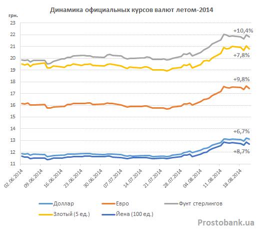 За лето-2014 официальные курсы основных иностранных валют выросли на 6,7-10,4%, больше всего подорожал доллар США. Именно дефицитом доллара на межбанковском рынке в НБУ чаще всего объясняют скачки курсов. Но официальные курсы остальных валют движутся практически синхронно с курсом доллара.