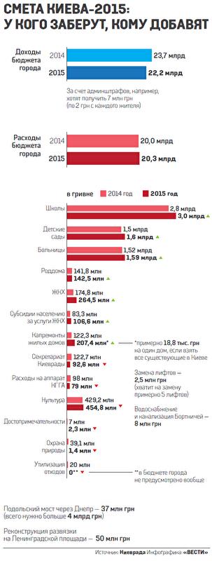 Ученикам младших классов вернули бесплатные обеды из расчета 8–10 грн за один. На это нашли 110 млн грн из доходов от парковочного сбора, паевого участия МАФовцев, а также из средств, выделенных КП «Киевпасстранс». Самому КП, которое из-за недофинансирования вынуждено сокращать количество маршрутов, разрешили использовать деньги от рекламы и предусмотрели 460 млн грн в виде дотаций от гор- и госбюджета. К хорошим новостям можно отнести то, что почти на 40 млн грн увеличили количество денег на Программу соцэкономразвития, из которой финансируются строительство и капремонт дорог, развязок, объектов инфраструктуры, — с 1,570 млрд, как было в первой редакции, до 1,608 млрд грн.