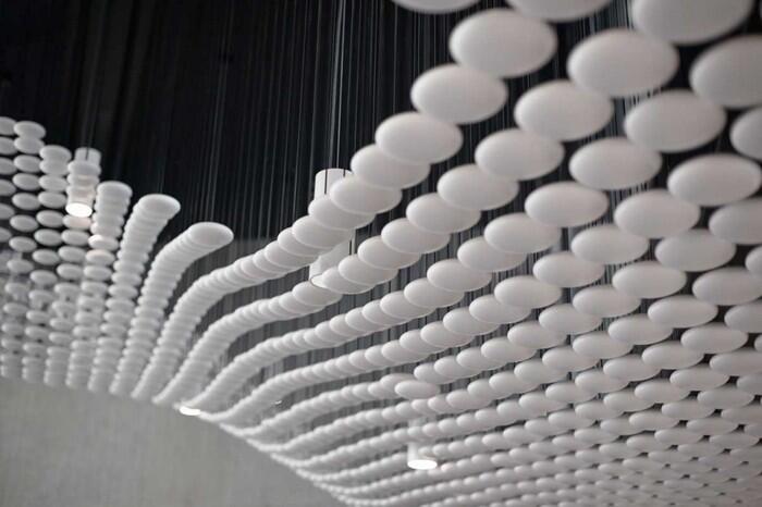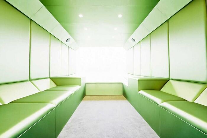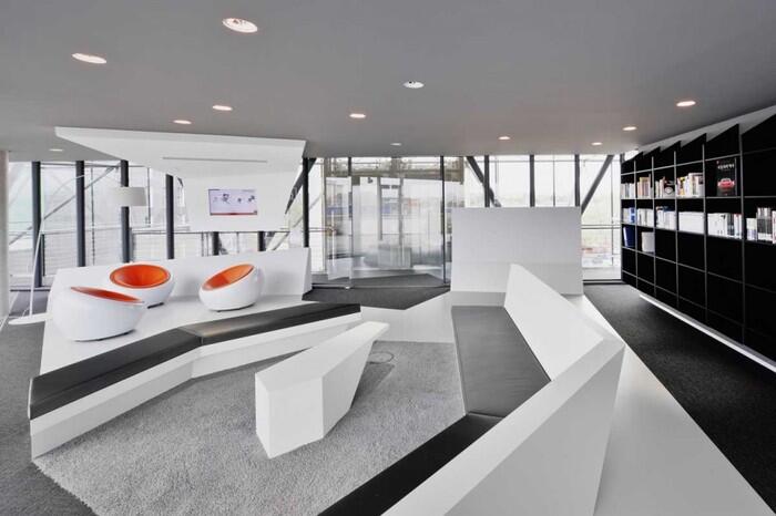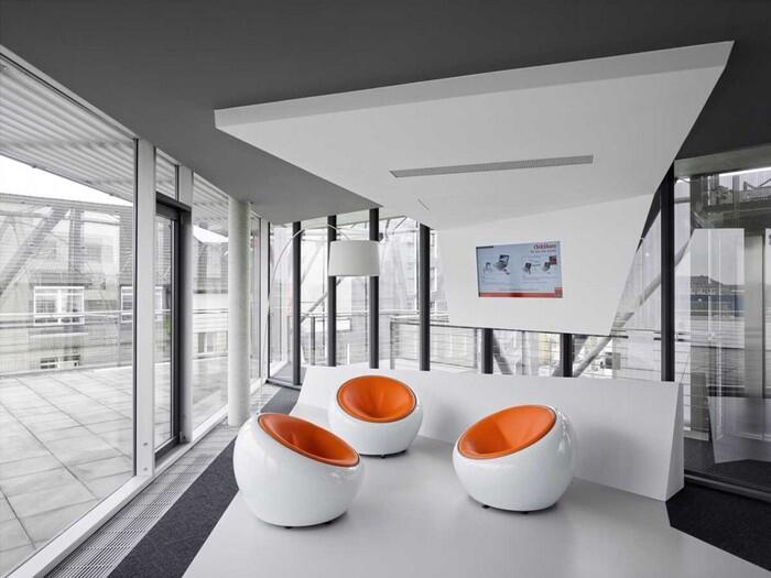 Динамизм и движение - ключевые особенности интерьерной концепции - охватывают сотрудников и посетителей, когда они входят в просторный приемный зал. Дизайн разработан как непрерывный поток, проходящий через открытые рабочие зоны и библиотеку для сотрудников вплоть до тренажерного зала на пятом этаже, который предлагает удивительный вид на Франкфурт.