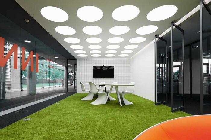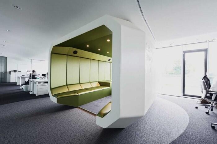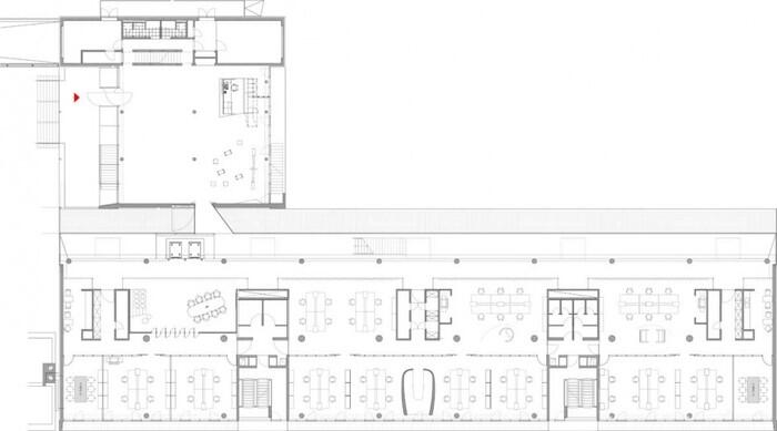 Многоугольные пространственные элементы и широкий ассортимент материалов представляют высокие стандарты и имидж самого агентства. Открытые и прозрачные рабочие пространства в сочетании с полуобщественными зонами и полностью изолированными конференц-блоками способствуют творческой и коммуникативной рабочей атмосфере.