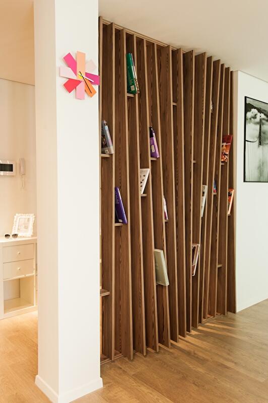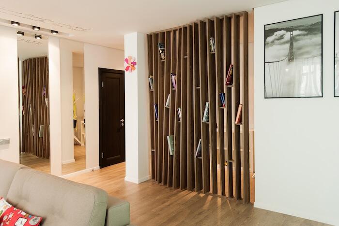 Наталия: Шаблоном для этой перегородки послужила конструкция, увиденная мной на просторах интернета. Мне очень понравилась идея волны, которая создается за счет расширения и сужения досок. Я применила ее не просто как элемент декора, но и добавила немного «функционала» — маленькие горизонтальные полочки, которые стали укрепляющим элементом, что было очень важно, так как конструкция крепилась не к стене, а к потолку и полу. Кроме этого, надо было, чтобы естественный свет поступал и в коридор, хотя он достаточно отдален от окон. А основную часть квартиры хотелось «прикрыть» при открывании входной двери. Посредством такой перегородки удалось справиться со всеми перечисленными задачами. Изготовлением занималась местная компания.