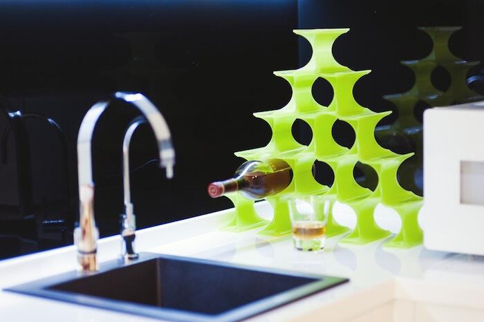 Обеденный стол, подставка под TV, тумба, лампа из рисовой бумаги и другие мелкие элементы заказывали в IKEA. Стулья — в Calligaris, прозрачные столики — Kare Design, духовой шкаф, варочная поверхность — Smeg, а салатовая подставка для бутылок — Kartell.