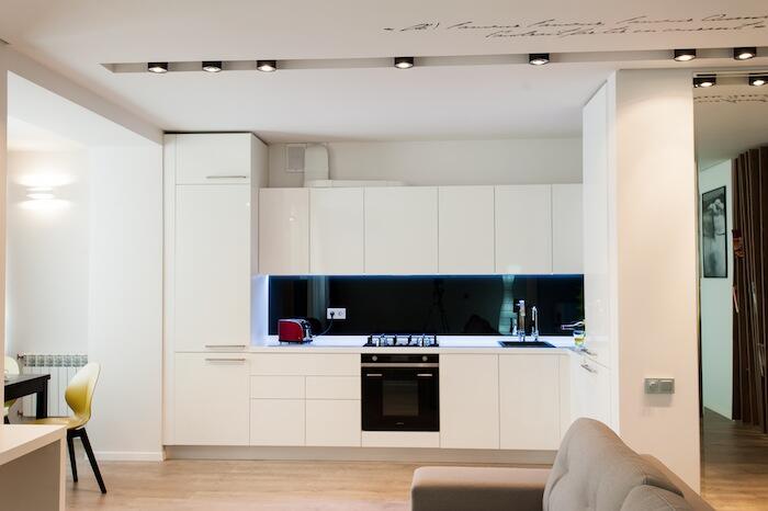 Наталия: Понимаю Ваш вопрос (Улыбается ). Белая кухня только выглядит маркой, на самом деле за ней ухаживать не сложнее, чем за любым другим цветом. Лаковое покрытие позволяет без труда избавиться от всего лишнего на фасадах. В данном варианте кухни почти везде отсутствуют ручки, и нужно немного чаще убирать «залапанности», которые предательски видны под разными углами, но это уже нюансы, которые коснулись бы любого цвета.