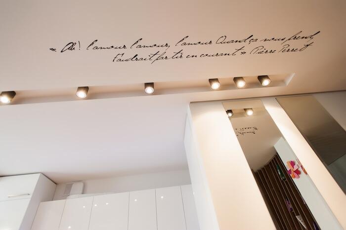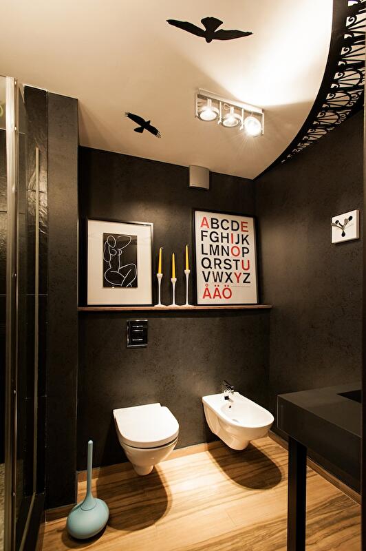 Для визуального расширения стены были окрашены в белый цвет. Изначальная задумка — цветовая комбинация белого, черного и серебристого. Пастельная гамма была разбавлена за счет ярких пятен декоративных элементов.