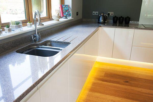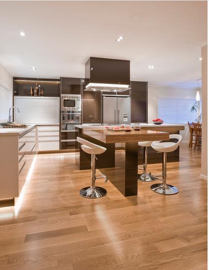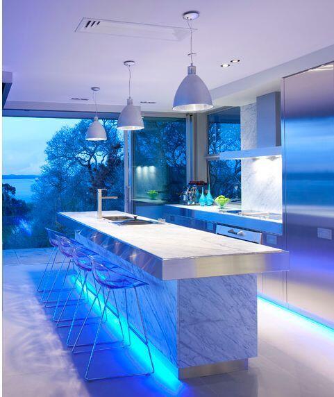 Да-да, вы не ослышались! Встраиваемая в нижнюю часть шкафов подсветка поможет создать настроение, когда вы уже приготовили ужин и накрыли на стол. Светодиодная лента или встраиваемые точечные светильники монтируются в углубление под нижними шкафами, они освещают пол и служат функциональным ночным светом.