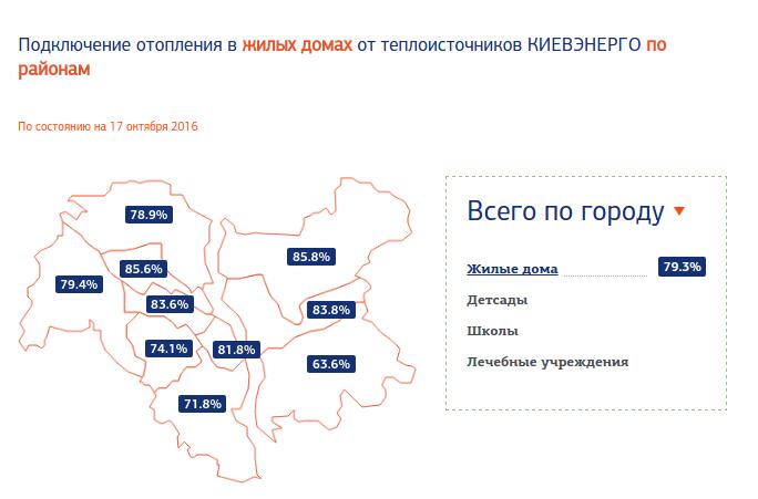 Як стало відомо Domik.ua, на ранок 17 жовтня теплом забезпечено вже 79% осель киян. «Це понад 7,5 тис. будинків. Найбільше – у Деснянському (85,8%) та Подільському (85,6%) районах міста. Соціальна сфера підключена майже повністю: на 99% дитсадки, 97% школи та 92% лікарні», - повідомили в компанії «Київенерго».