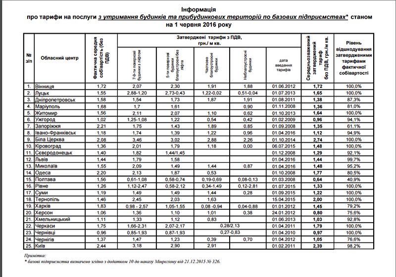 Міністерство регіонального розвитку, будівництва та житлово-комунального господарства України опублікувало інформацію про тарифи на послуги з утримання будинків та прибудинкових територій житлово-експлуатаційними конторами станом на 1 червня 2016 року по обласних центрах України.