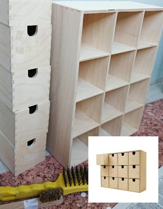 Фасад ящиков с их вырезами слишком примечателен, это уже визитная карточка этих комодов. Во-первых, мне лично такая система ручек неудобна. Во-вторых, мне всегда больше нравились ящики с плотно подходящими друг к другу фасадными панелями (почти бесшовные). Поэтому я заказала лазерную резку дубового шпона (4мм) нужных мне размеров (это обошлось около 500р, что совсем недорого). Размеры я брала с зазором между панелями и с припусками по бокам. У меня выходило 85×84мм, но стоит промерять по месту.