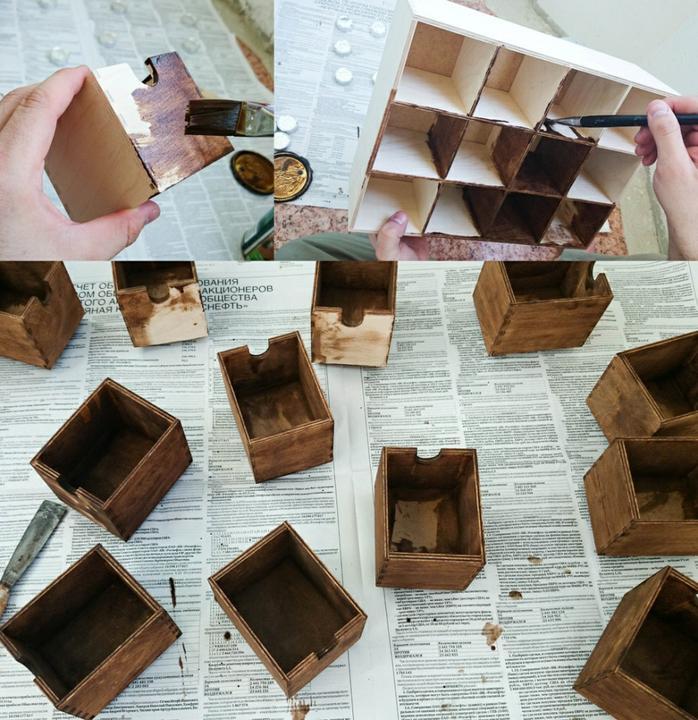 Далее берем обыкновенную морилку и при помощи кисти, мужа и терпения выкрашиваем короб и все ящички изнутри и снаружи. Можно не прокрашивать дно и фасад (сверху и снизу, далее оно будет закрыто текстилем).