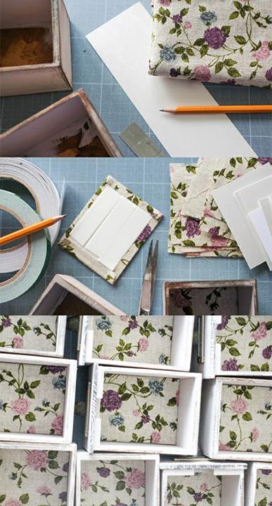 Делаем дно для ящиков. По задумке оно должно быть обито льном. Для этого вырезаем прямоугольник из картона, на 2мм меньше дна ящика и обтягиваем его, загибая края ткани на другую сторону. Все это фиксируем клеем и двусторонним скотчем, после чего устанавливаем на место.