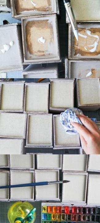 Для того чтобы покрасить ящики в один заход и выставить их спокойно на просушку, можно поставить их на небольшой предмет. Используйте обычные свечки-таблетки, тогда ни одна из окрашенных сторон не касается газеты и не нужно потом что-то исправлять.