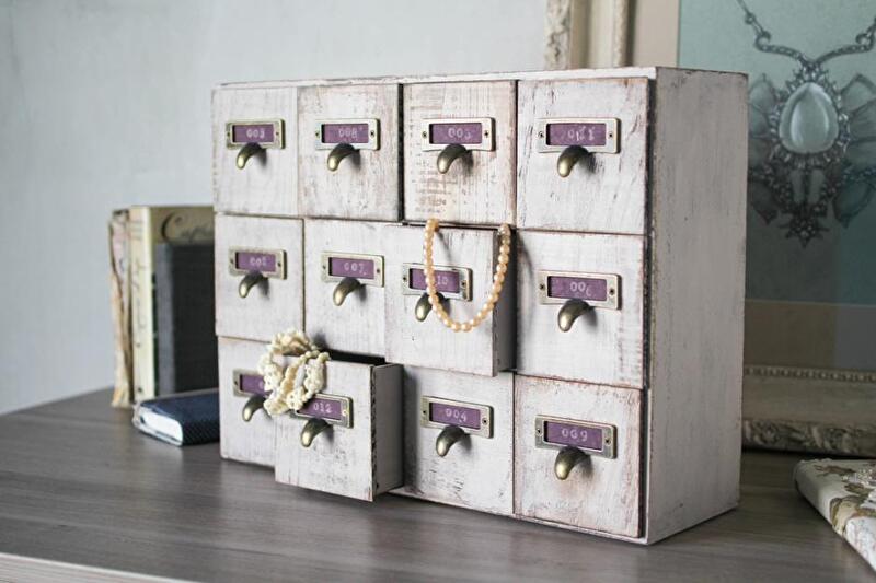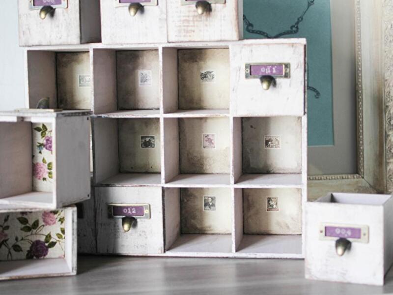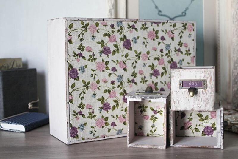 Составляем все ящички вместе и крепим ручки. Также можно слегка затонировать патиной грани и края ящиков.
