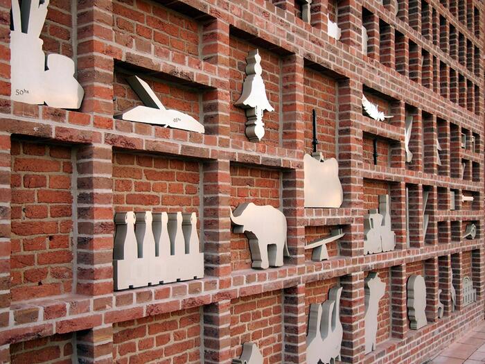 Дизайнеры Studio Wessels Boer решили декорировать глухой кирпичный фасад одного из таких "десятицентовых домов" оригинальной инсталляцией, напоминающей типографский ящик для хранения символов наборщика. Это отсыл к газете, издаваемой некогда кооперативом BVEW.
