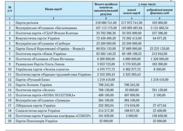 З цих звітів дізнаємося, наприклад, що Партія регіонів зібрала удвічі більше коштів, ніж "Батьківщина", а партія Наталії Королевської зі своїми 60 мільйонами потрапила у п’ятірку найзаможніших за надходженнями до передвиборчого фонду.