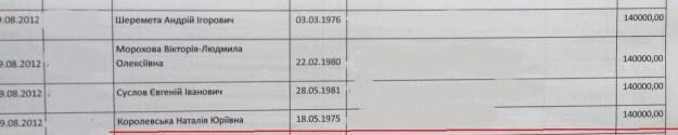 Добровільний внесок від громадян для партії Королевської "Україна — вперед"! кілька разів робила громадянка Наталя Королевська. Першу суму в розмірі 140 тисяч гривень вона перерахувала 20 серпня 2012 року. Через тиждень додала ще 140 тисяч, і останній транш 30 серпня – теж на 140 тисяч.