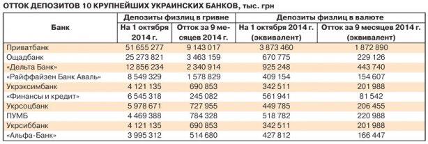 Но вскоре после известных событий конца августа отток вкладов из системы возобновился. По данным НБУ, общий объем депозитов в национальной валюте в сентябре по сравнению с августом действительно увеличился на 2,5% (с начала 2014 г. уменьшился на 7,8%) — до 389 млрд грн. Вот только произошло это за счет роста остатков на депозитных счетах юридических лиц на 11,1% (с начала года — на 7,5%) — до 181,5 млрд грн. При этом остатки на счетах физических лиц все-таки уменьшились — до 207 млрд грн (с начала года — на 18%).