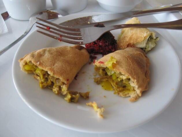 На 25 гривен можно съесть: овощную пиццу с сыром сулугуни, яблочный самос с изюмом и корицей, травяной чай или компот из сухофруктов.