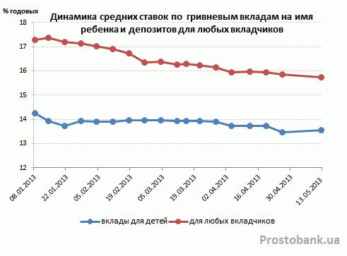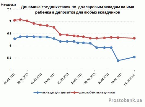 По исследованию компании «Простобанк Консалтинг» на 13.05.2013 года, лучшее предложение по детским депозитам в долларах от банков из числа топ-50 по активам – 8% годовых (банк «Хрещатик»), что на 3 процентных пункта ниже максимальной ставки на рынке по вкладам в американской валюте.