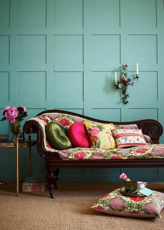 Как и любой выразительный, яркий элемент, диван с цветочным орнаментом будет лучше смотреться на фоне однотонных стен, ковра без рисунка — на контрасте яркий орнамент будет смотреться действительно выигрышно.