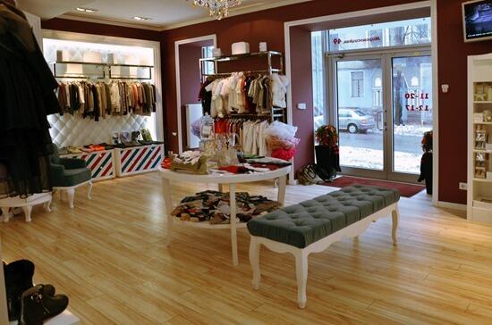 Пол может быть просто однотонным, но главное – не скользким. Детки любят бегать, а на скользком полу, вы сами понимаете, это небезопасно. Также нежелательно делать всевозможные ступеньки. Конечно, если площадь торгового зала магазина детской одежды позволяет, то можно возвести один подиум, чтобы маленькие модники устраивали своим родителям мини-показы в новой одежке. А вот потолки можно и, наверное, даже нужно сделать многоуровневыми – это может также заинтересовать детишек.